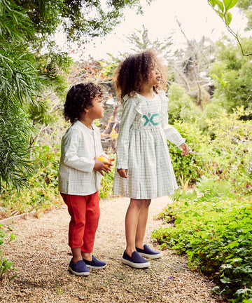 Our hand smocked dress in our signature geometric smocking pattern. Collar and cuffs have a hand embroidered edging. Our waist on this dress is generous to allow for the tie back to size to the perfect fit. In a green tattersall soft cotton with a four-button back. Comes with a matching undie cover.