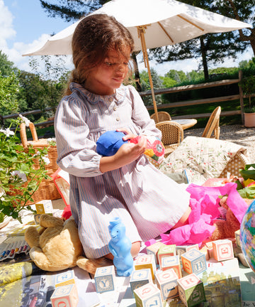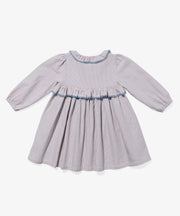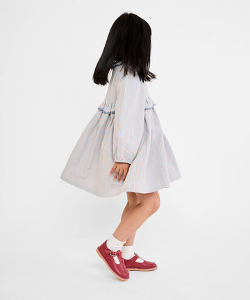 The Hannah Dress is as sweet as can be. Inspired by a childhood wallpaper founder Claire grew up with and designed with alternating stripes, the dress has a timeless silhouette with a ruffled collar and delicate lace trim detailing. Made with comfy elastic arms and easy-to-use buttons placed at the front, it’s perfect for picture day—and everyday!