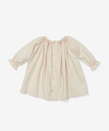 This beautifully smocked dress is designed to grow with your child. A dress at first, then as a tunic with its hand embroidered ruffled bloomer showing and later on even as a top with pants. In our lightweight oatmeal flannel with pink smocking.